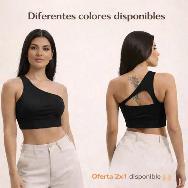 Su diseño asimétrico de un solo hombro combinado con tela elástica de alta calidad brinda un ajuste firme que estiliza la figura, sostiene sin brasier y se adapta al cuerpo sin marcar. Es cómodo, versátil y pensado para verse bien todo el día.